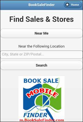 Touch 'Near Me' to find book sales and book stores within 50 miles! Your device may ask if it's OK to use your current position - just touch yes.