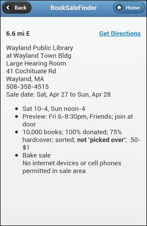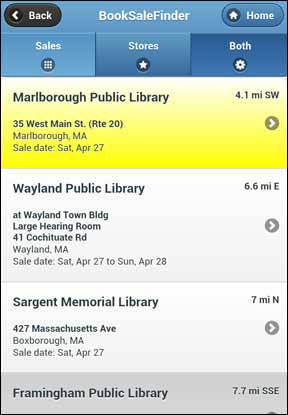 Notice that you see the dates of each sale (up to 2 weeks in advance), along with the direction and distance from your location. At the top of the screen, you can also touch 'Stores' to find used book stores within 50 miles, or touch 'Both' to find all sales and stores together on one screen.